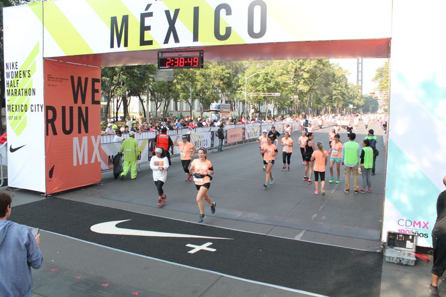 Empezó el himno nacional y me empezó a entrar la emoción, corriendo ya de vuelta en México y esta vez tendría a mi familia. Mis amigos me apoyaron en los últimos, y aunque les agradezco el mundo, no hay nada como ver una cara familiar en la meta. Claro que momentos antes empezó un anuncio de Nike, de esos que sientes que te hablan personalmente a ti, llenándote de energía y de emoción y me entro el sentimiento, de que aunque no había corrido más de 8k en un año por mi lesión, eso no dejaría que no lo disfrutara y que no acabara. Si se me salió la lágrima, por todas las que no pudieron y por las que estábamos ahí listas de empezar el nuevo reto. Esta vez no vencería mi tiempo, sino a mi lesión. Empezó la carrera y todas empezaron a correr como en tetris, cada quien tratando de esquivar gente y buscando su lugar y sus amigas. Resistí la pregunta de saber dónde estaría si mi espalda estuviera bien, pero sacudí el sentimiento y recordé lo feliz que me pone correr. Me encontré sonriendo, el Ángel nunca se había visto tan bonito, y me sentí en paz con mi velocidad. Todo se estaba dando perfectamente, y como buenos mexicanos, porras y gritos en todos lados. Alrededor de los 4k me di cuenta que había otra carrera, y aunque no entendí ni su nombre ni de lo que era si identifique a mucha gente con la camiseta en sillas de ruedas. Como sentí algo dentro de mí que ardía. Aquí estoy yo quejándome de mi lesión pero sigo corriendo, esa gente es la que se debe de admirar, ya que hacen más de lo que gente con todas sus capacidades puede hacer. Dejé ahí la connotación mala que tenía de mi espalda, si ellos pueden, claro que yo también, que ejemplo de personas a seguir. Por un momento compartí mirada con una chava mientras batallaba con su silla, las dos nos sonreímos y nos dimos ese aliento para seguir adelante. El ambiente estaba increíble y me sentía como en casa. También agradecí mi ignorancia a la ruta. Normalmente investigo que tipo de carrera será para entrenar de acuerdo con ella pero no la corro hasta el día del evento. Eso lo hago para siempre estar atenta, divirtiéndome y para no tener una mala experiencia que me arruine (ah por aquí me cansé o ah por aquí no me gustó), siempre me funciona. Pero pácatelas, que se viene una colina de no 1, ni 2, pero de 3 kilómetros y me tenía que recordar que no parara, que puedo ir despacio pero nunca pararme. Pasando los 15k habían unas pantallas en donde en una parte era una cámara y en otra parte decía los nombres de las que íbamos corriendo y decía una frase. La mía decía algo como ¨recuerda porque empezaste¨, Oh Nike, como sabes que decir en todos los momentos, era lo que necesitaba.